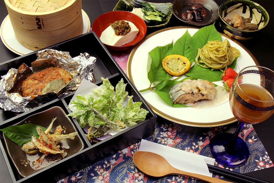 地元の旬の野菜や山菜、新鮮な川魚などをたっぷり使用した、和洋折衷のオリジナル料理をご用意いたします。